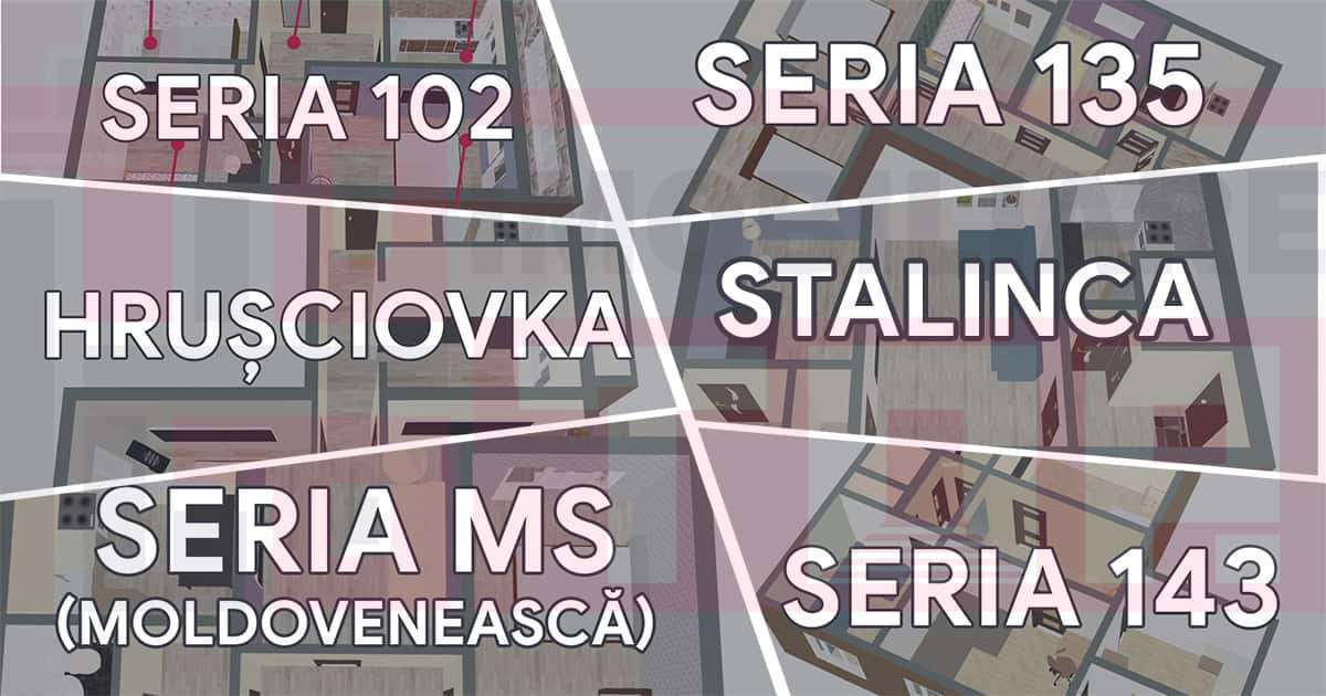 Stalinca, Hrușciovka, Brejnevka, Seria 102, 135, 143, MS — ghid complet al seriilor de blocuri sovietice din Chișinău cu caracteristici tehnice, suprafețe și sfaturi de identificare.